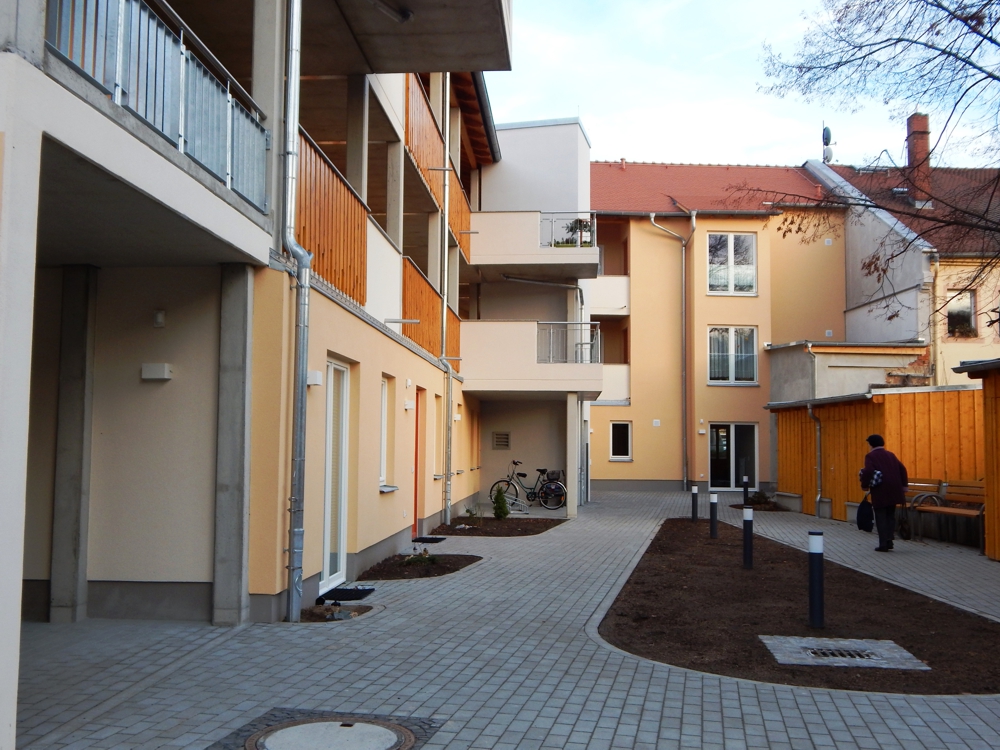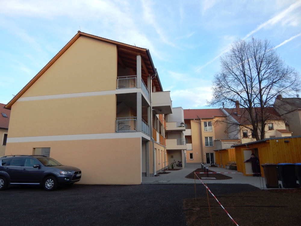 In Ostritz wurde im November ein bedeutendes Projekt beendet: Das seit Jahren leerstehende Einzeldenkmal in repräsentativer Lage am Markt wurde seit 2014 umfassend saniert und nun seinen Bewohnern zur Nutzung übergeben. In dem Komplex sind 12 altersgerechte Ein- und Zweiraumwohnungen mit 31 m² bis 60 m² Wohnfläche entstanden. Die Wohnungen werden über einen Laubengang im Innenhof erschlossen, welcher auch Platz für einen gemeinsamen Aufenthalt der Bewohner bietet. Im Innenhof befindet sich zu jeder Wohnung ein abschließbarer Schuppen, in welchem beispielsweise Gehhilfen abgestellt werden können.